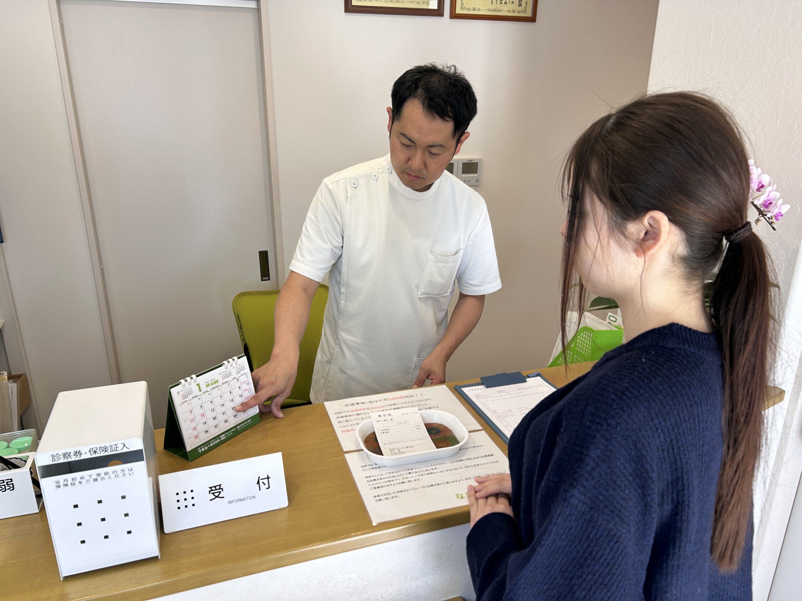 施術が終わりましたら、受付にて施術費のお支払いをお願いいたします。お支払いは現金のみとなっております。あらかじめご了承ください。次回のご予約も承ります。